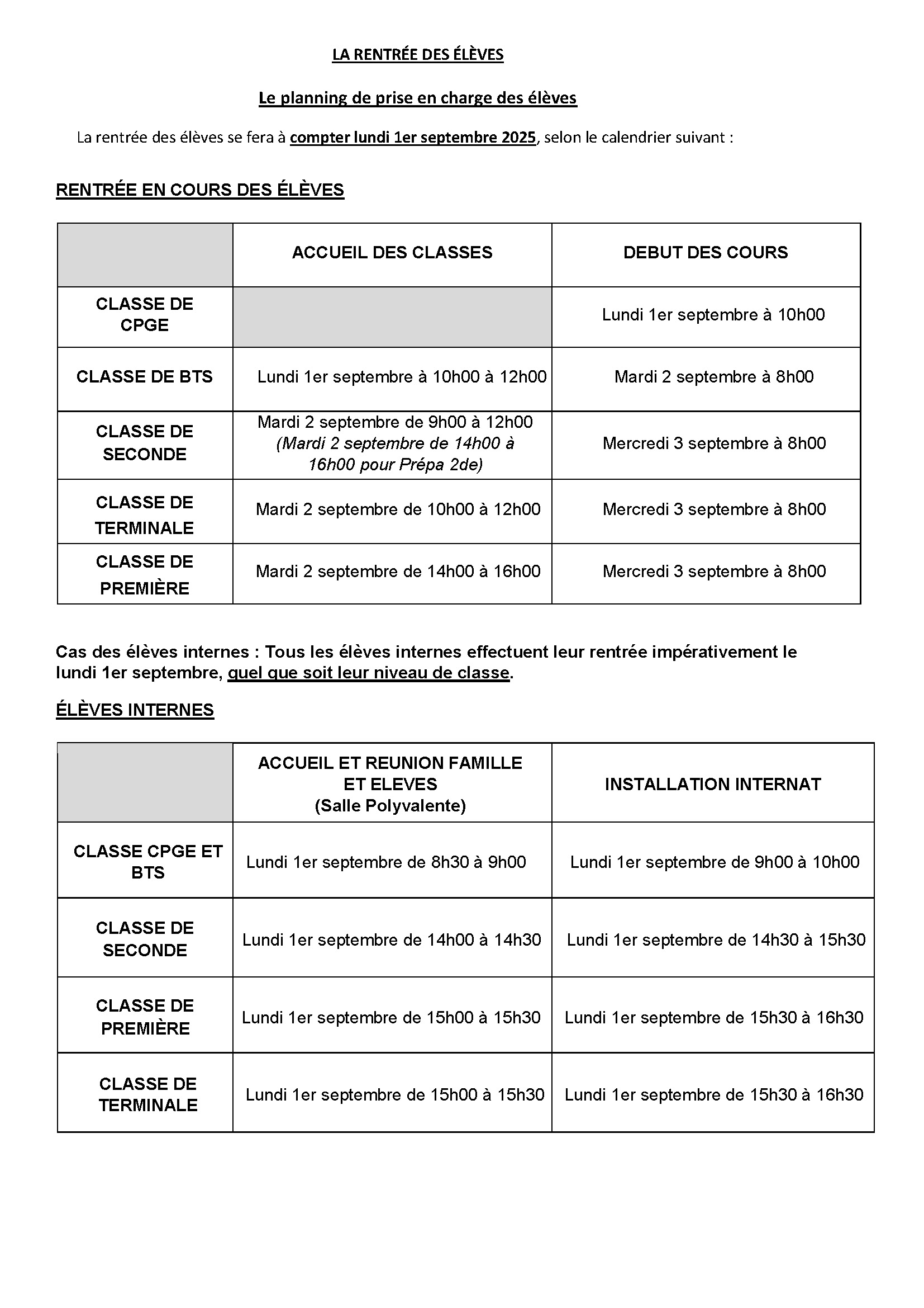 Cas des élèves internes : Tous les élèves internes effectuent leur rentrée impérativement le mardi 2 septembre, quel que soit leur niveau de classe.